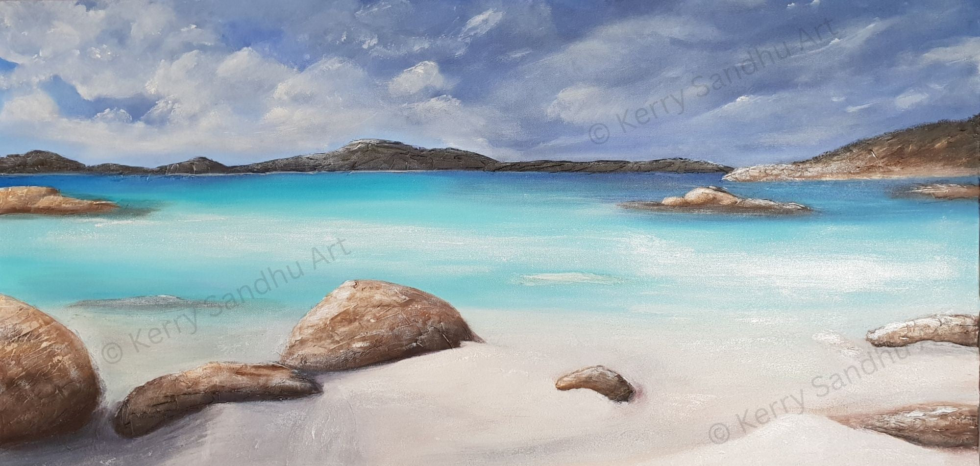 This painting is full of beautiful textures in the rocks and sand and has the most dreamy blue and turquoise water imaginable.