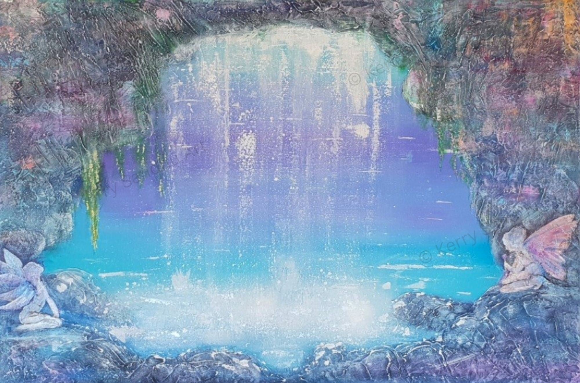 This painting is a whimsical view of a fairy playground inside a waterfall - the result of me getting in touch with my inner child through meditation and the painting that came through.